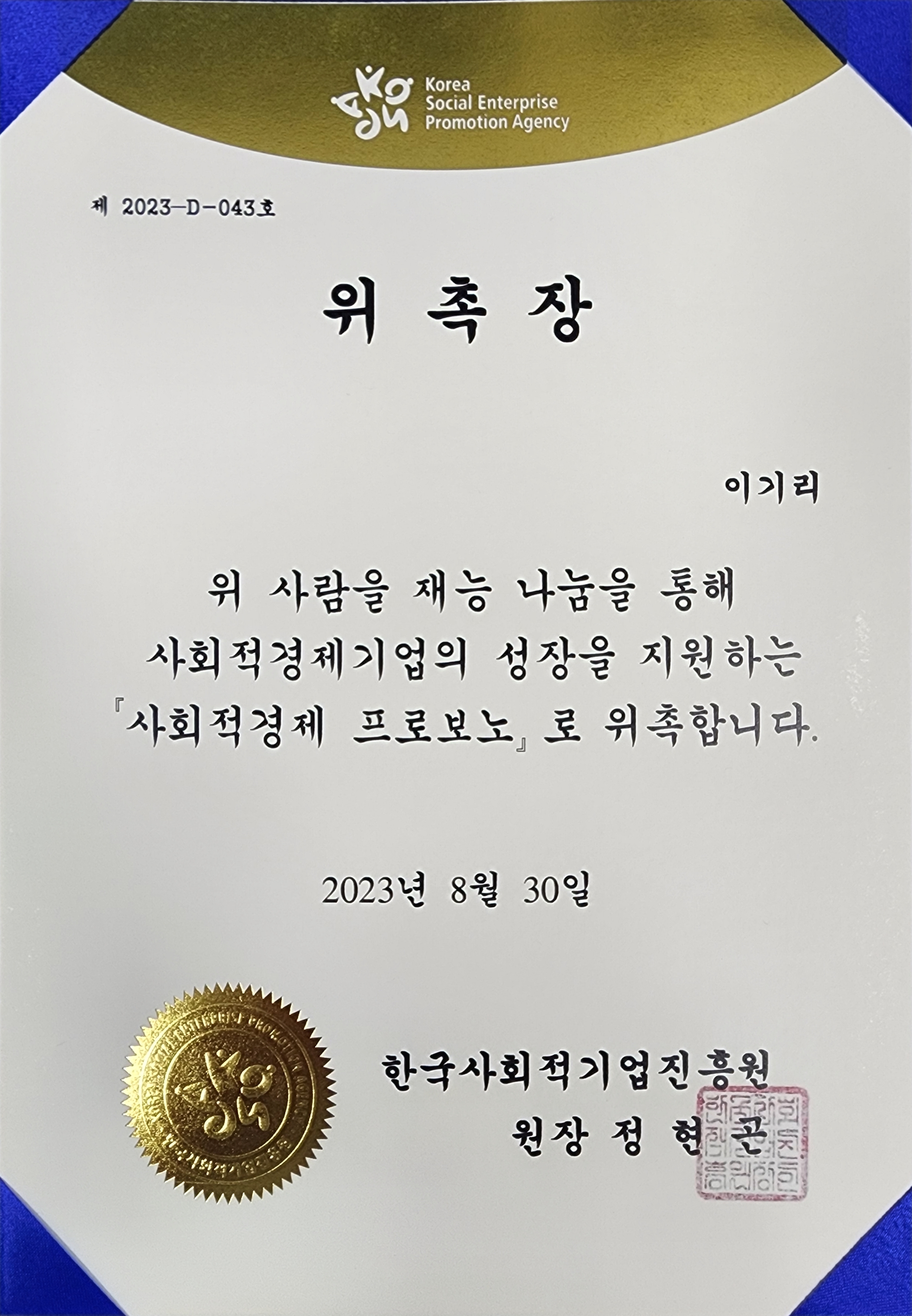 9월 5일 한국사회적기업진흥원 주관 사회적경제 프로보노 오리엔테이션 행사에서 법무사 프로보노로 위촉되었습니다.