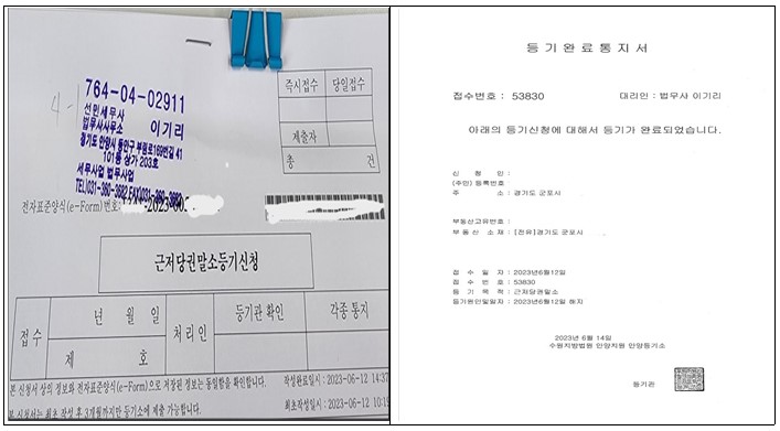 망자의 상속인이 근저당권말소등기신청을 의뢰한 것으로 해지증서 작성대행 및 등기필정보를 받으러 금융기관에 출장까지 다녀온 후 무사히 등기가 완료되었습니다.