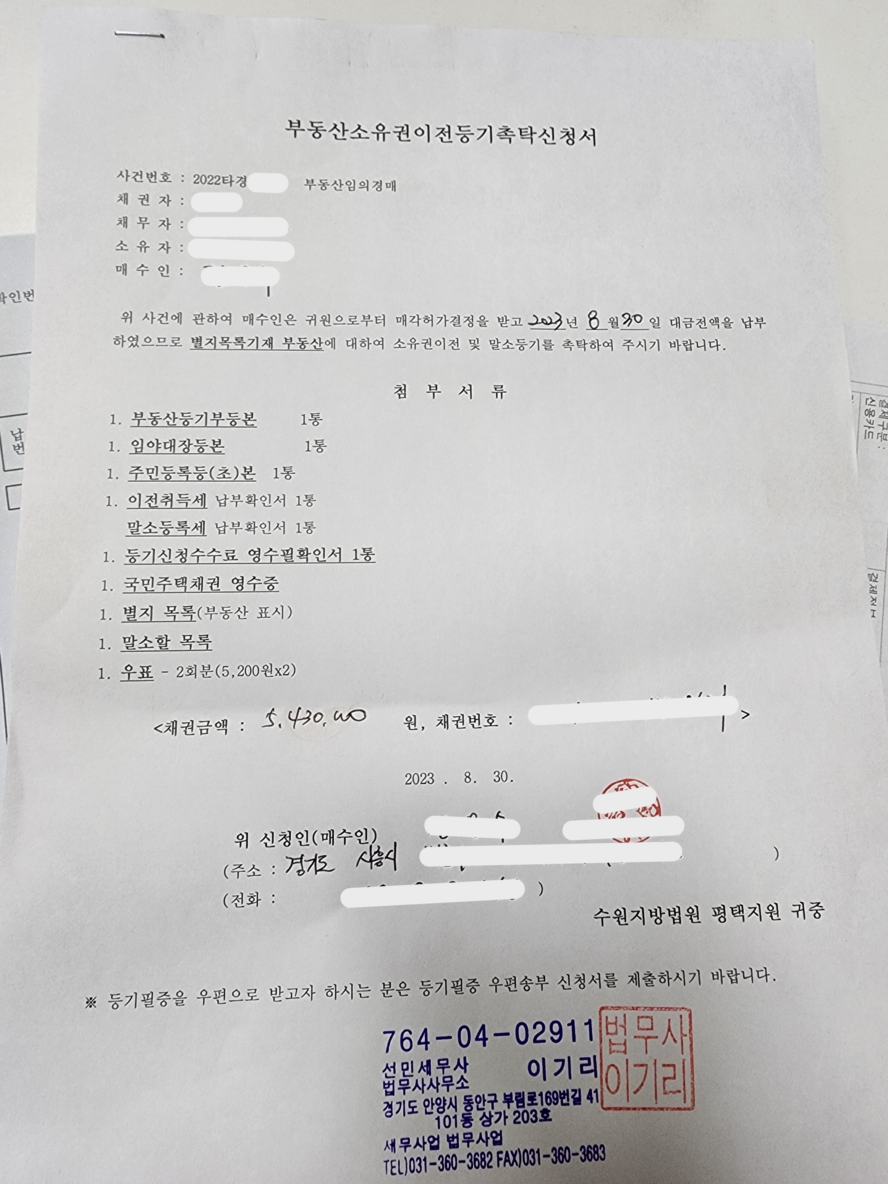 소유권이전등기촉탁(경매낙찰이전) 신청할 때 들어가는 필요서류와 비용에 대하여 간략히 안내 드립니다.