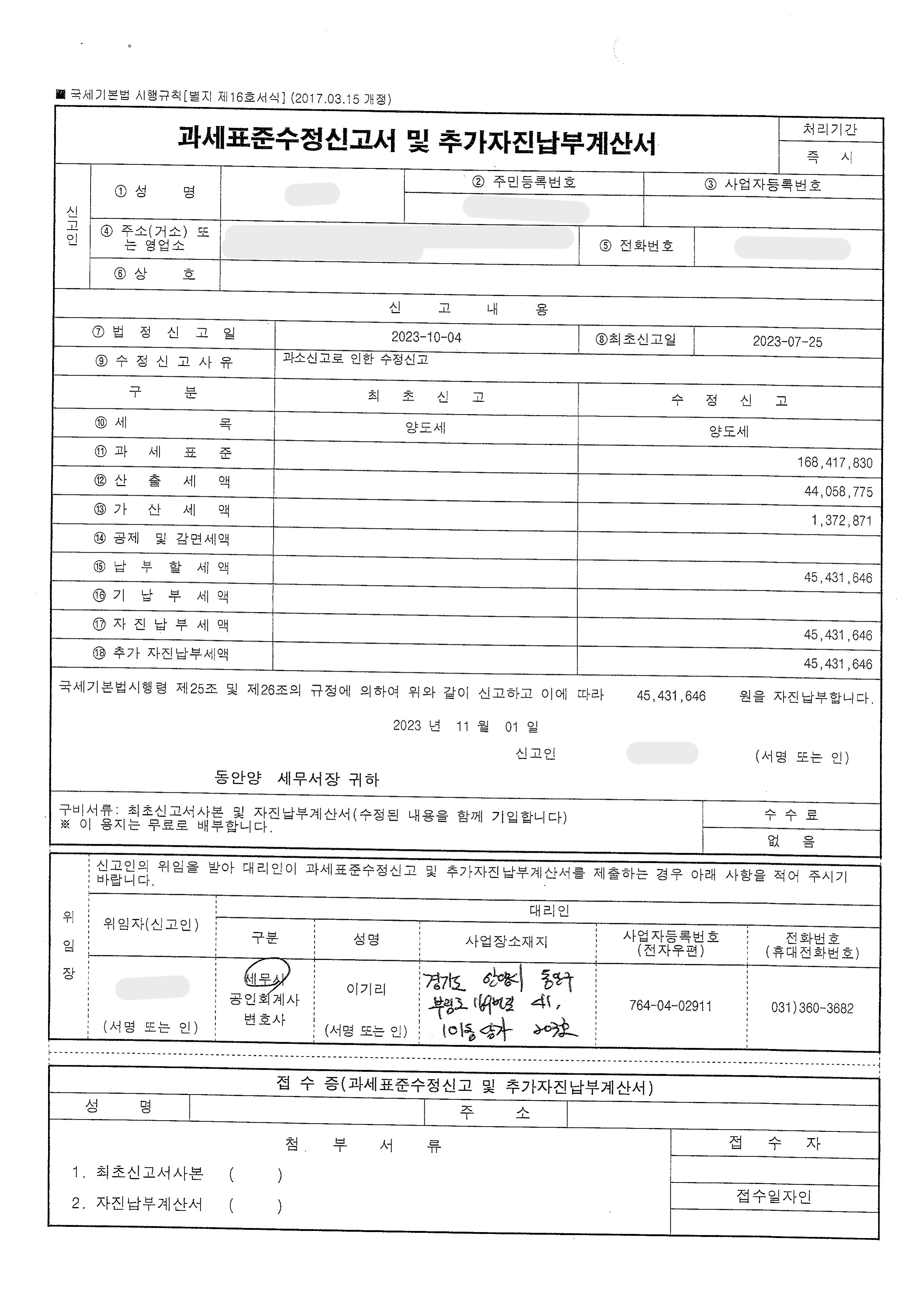 수정신고를 할 경우에는 과세표준수정신고서 및 추가자진납부계산서와 최초 신고서 사본(홈택스에서 출력가능), 새롭게 계산한 과세표준 신고 및 납부계산서를 제출하여야 합니다.
