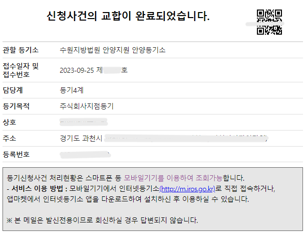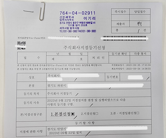 지점설치등기(관내) 신청 사례