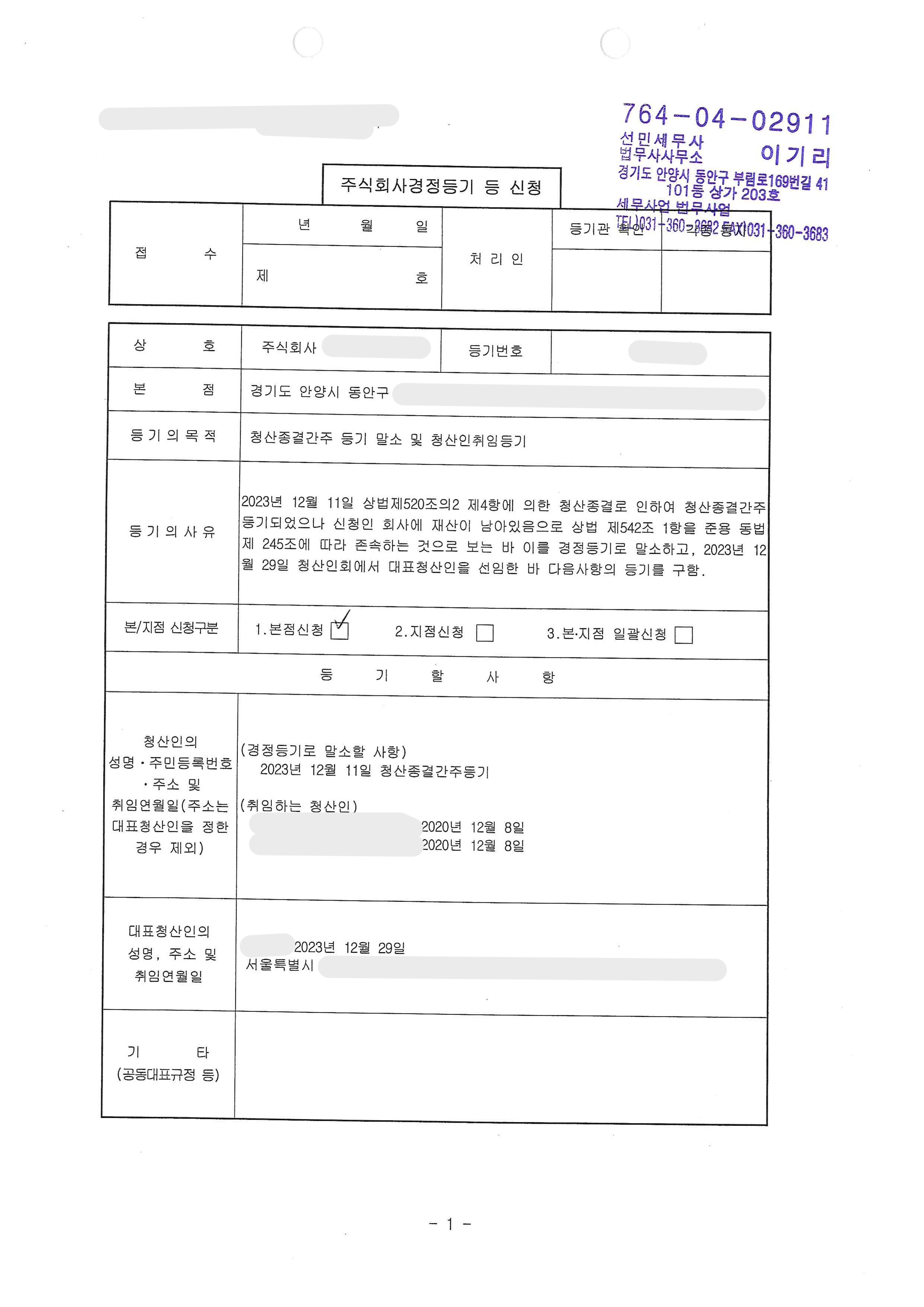 주식회사 경정등기(청산종결간주 말소 및 청산인 선임) 신청 사례
