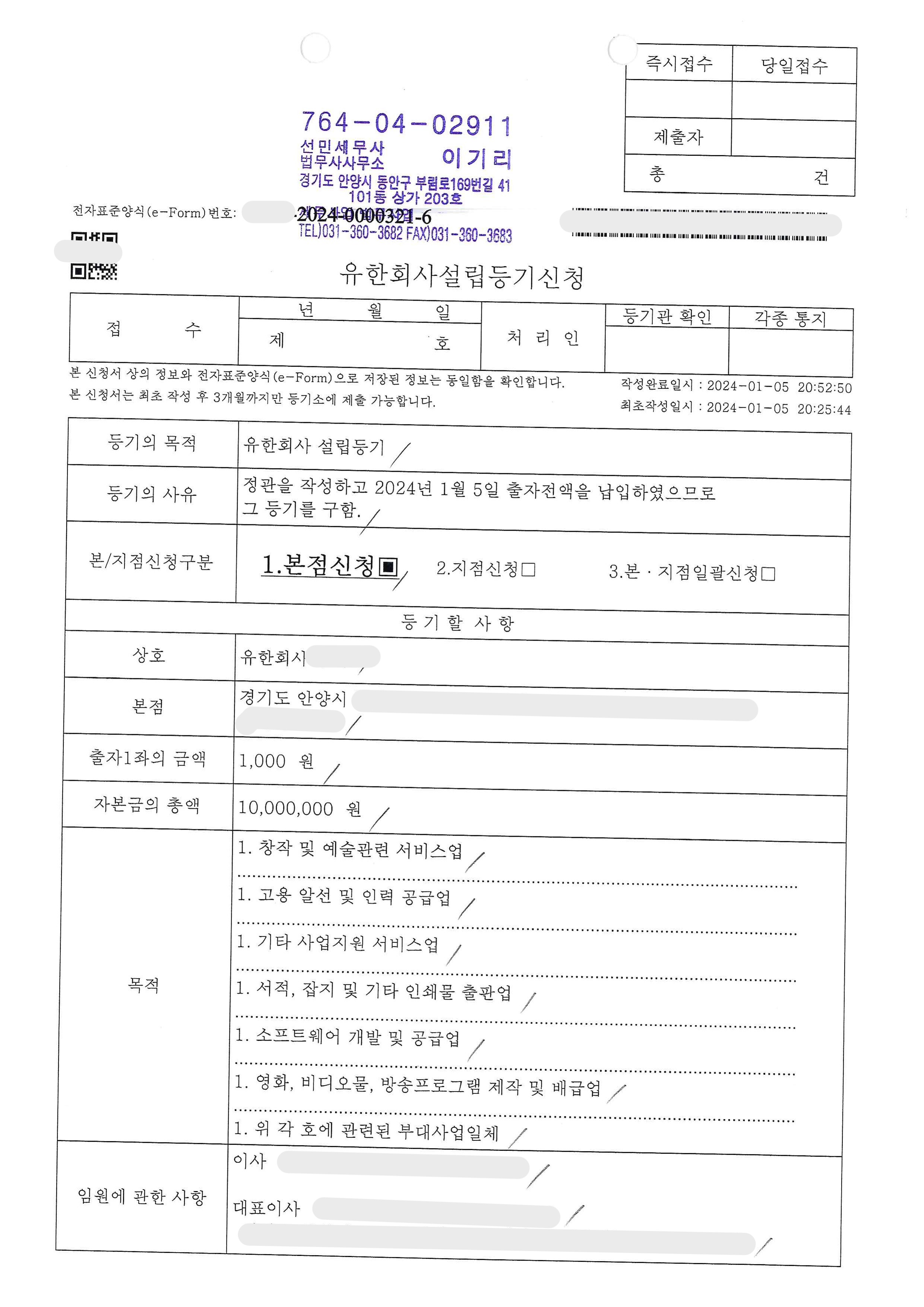 유한회사 설립등기와 함께 사업자등록 절차까지 한번에 진행한 사례입니다.