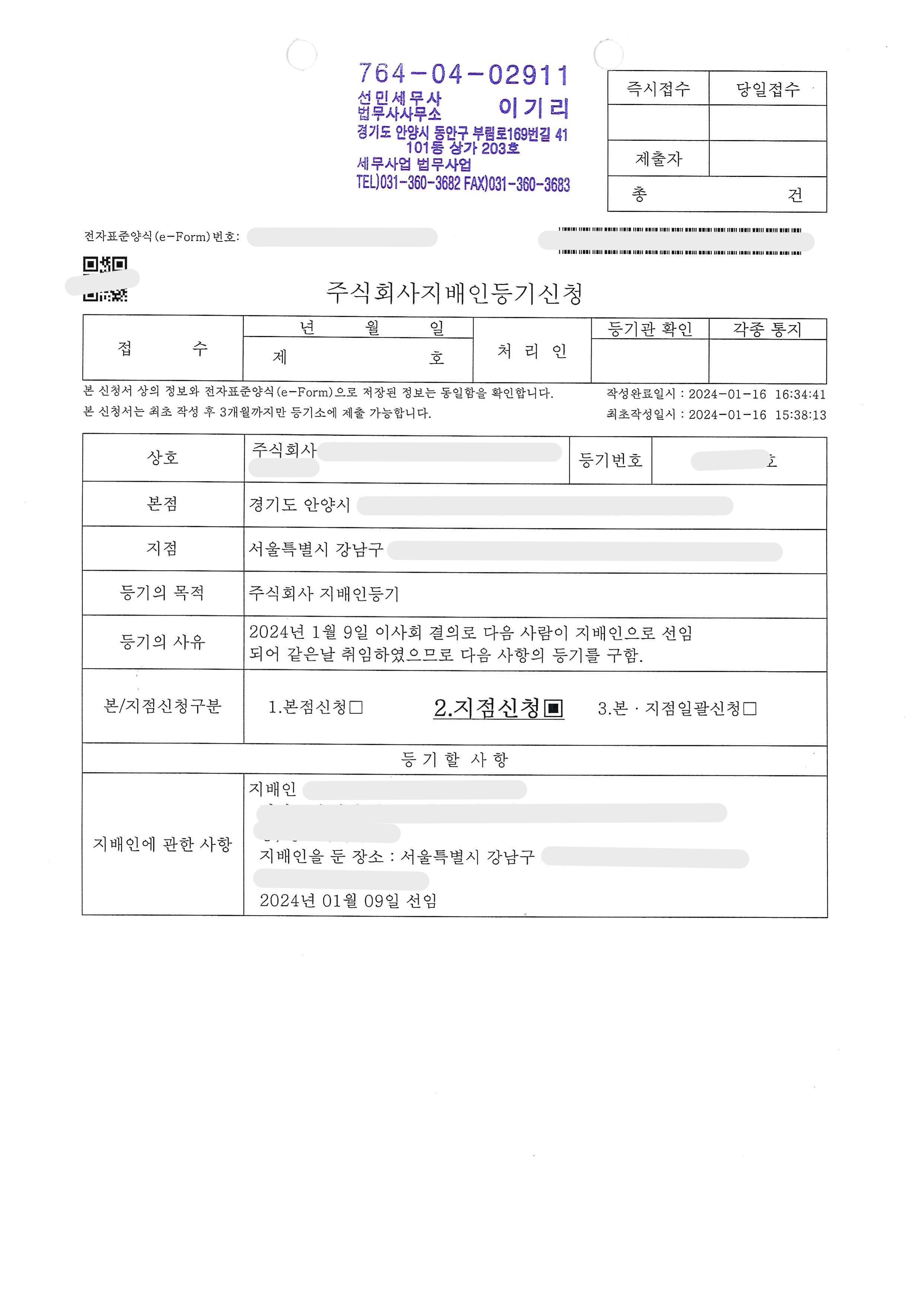 지점의 지배인 선임등기와 동시에 사업자단위과세사업자의 종된사업장 등록도 진행 완료하였습니다.