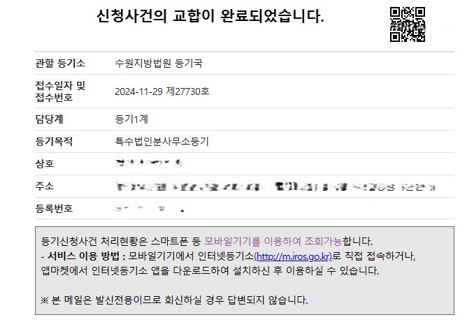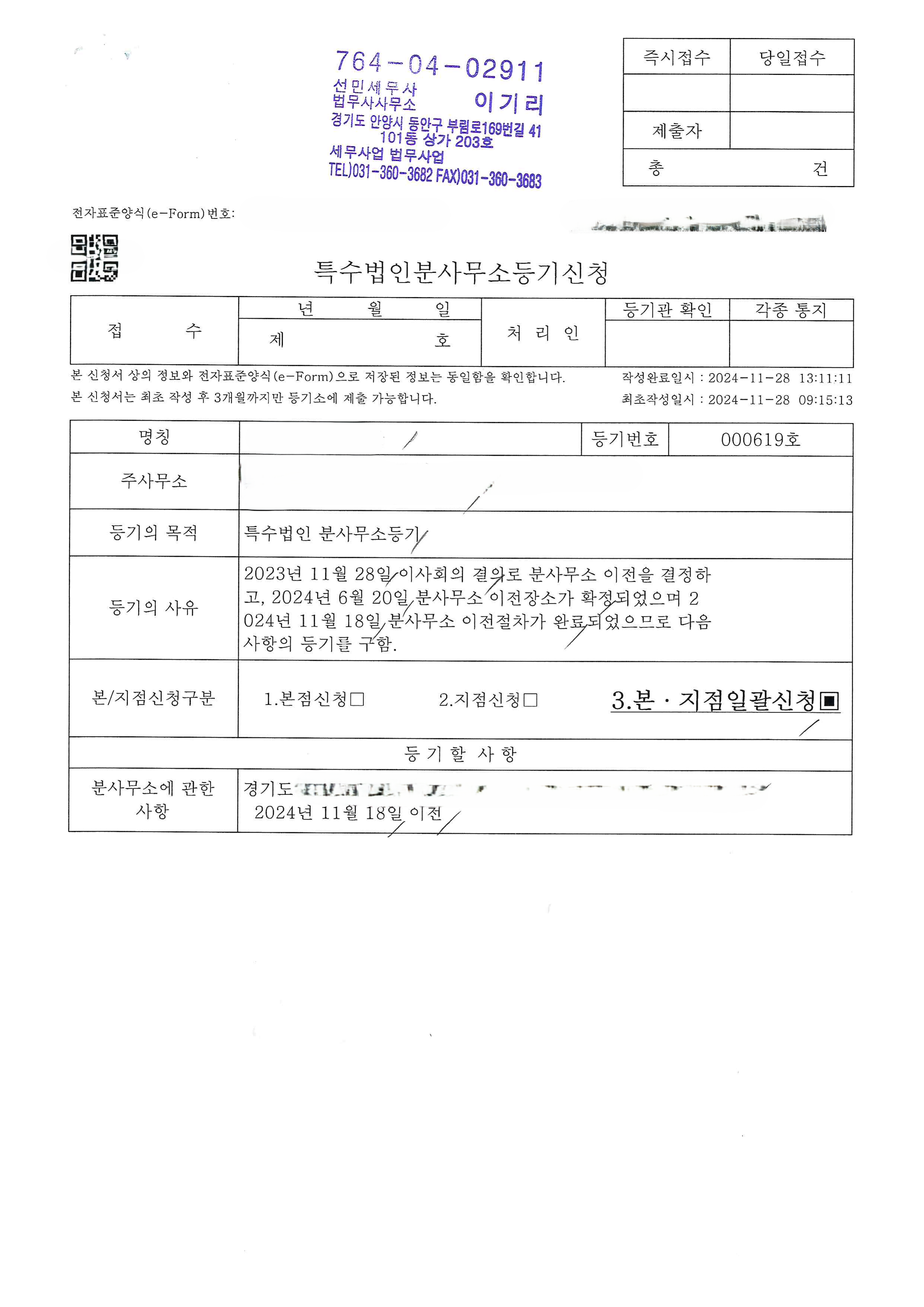 특수법인 분사무소이전등기 신청 사례